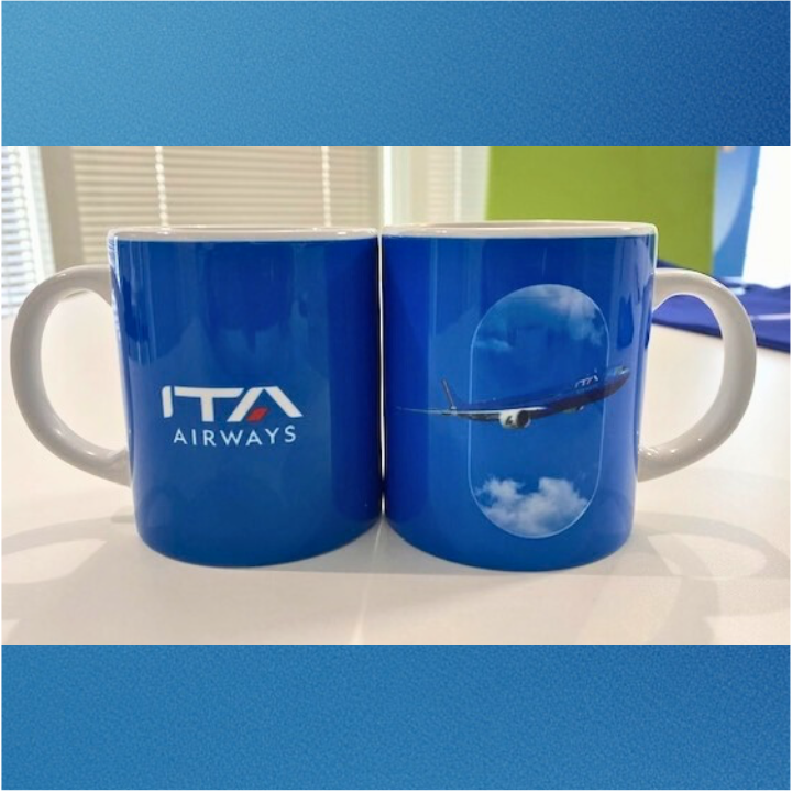イタリア最大の航空会社であるITAエアウェイズは、羽田‐ローマを最新鋭機A359で毎日運航。機内デザインから制服、ミシュランスターシェフが監修するビジネスクラスの食事まで、搭乗時からイタリアを感じられる。イタリアへの旅に思いを馳ながらほっと一息つけるマグカップ。(提供:ITAエアウェイズ)