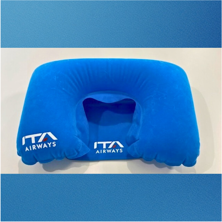 イタリア最大の航空会社であるITAエアウェイズは、羽田‐ローマを最新鋭機A359で毎日運航。機内デザインから制服、ミシュランスターシェフが監修するビジネスクラスの食事まで、搭乗時からイタリアを感じられる。空の旅が快適になる、ネックピロー。(提供:ITAエアウェイズ)