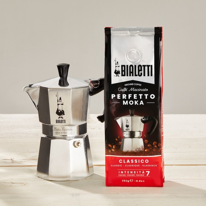1919年創業のイタリアメーカー、ビアレッティを象徴する「モカエキスプレス」。モカエキスプレスに最適なブレンドとして、アラビカ種とロブスタ種を50:50で配合。自分で淹れる一杯が、日常に贅沢な時間と本場の味わいをもたらしてくれる。(提供:ビアレッティ ジャパン)