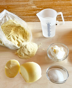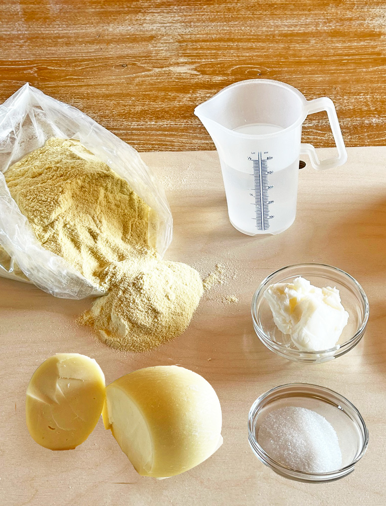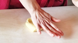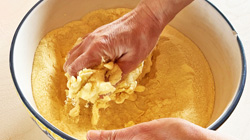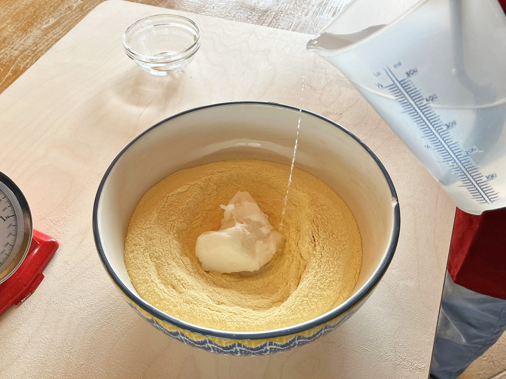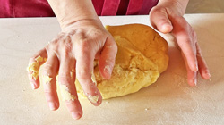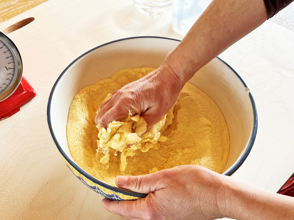 - デュラムセモリナ粉とラード、塩ひとつまみをボールに入れ、常温の水を少しずつ3回にわけて入れ、手で混ぜていく。(写真a,b 参照)