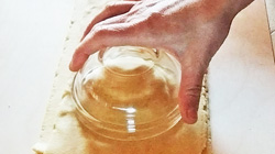 - 再度重ねた生地の上から直径10cmの器で筋をつける。(写真l 参照)
