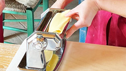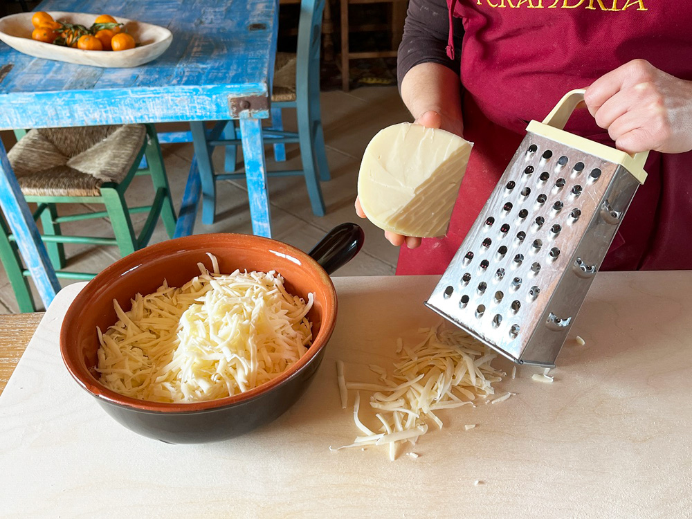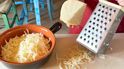- ペレッタチーズを削る。お好みにより、レモンやオレンジの皮を削ったものや砂糖をひとつまみ加える。(写真e 参照)