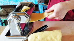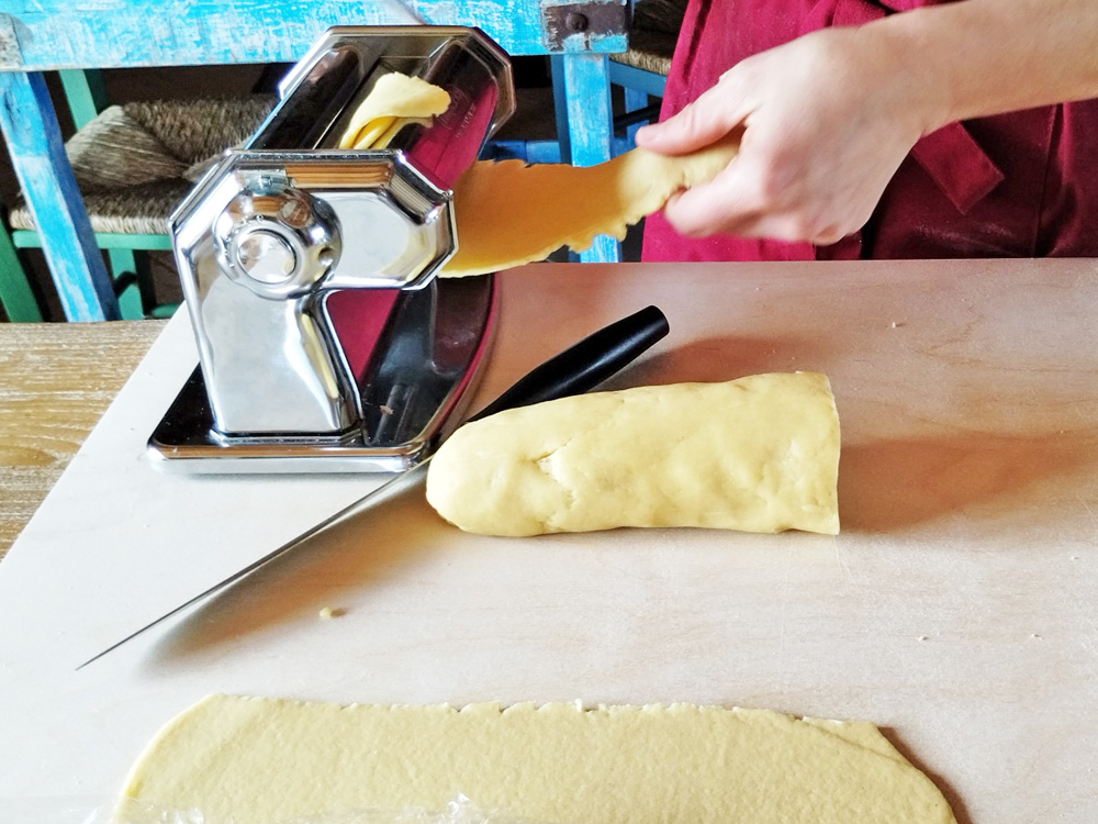 - パスタマシーンでのばす。最初は5。最後は2の2~3mm程度の厚さまで伸ばす。(写真g,h 参照)