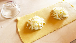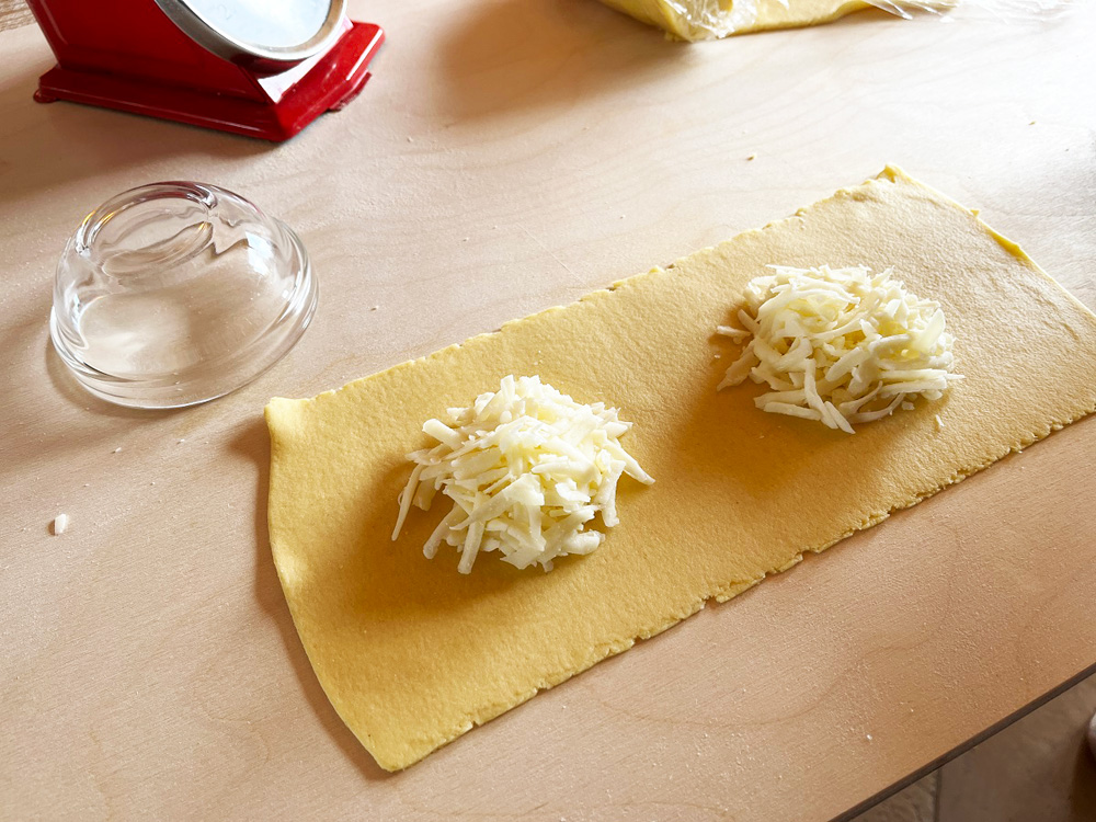 - 生地を直径10cmの器で筋をつけ、チーズをのせる。(写真i 参照)