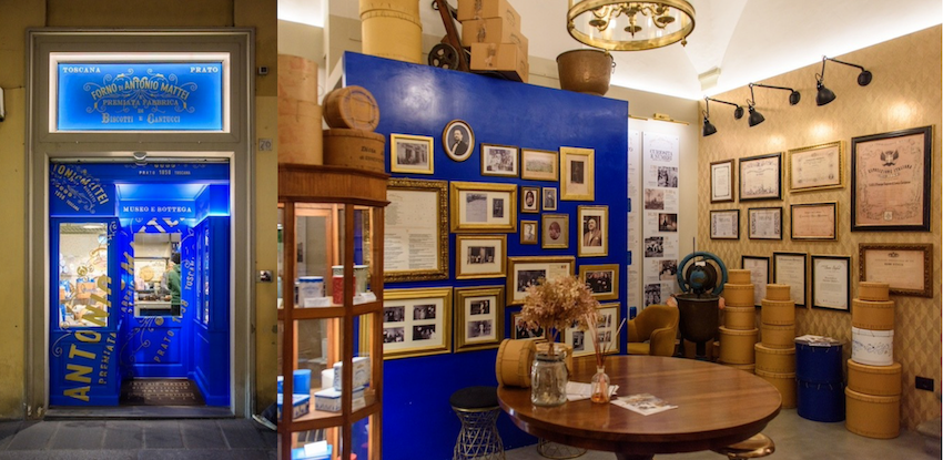 1858年にプラートのパン職人アントニオ・マッテイが設立したビスコッティ工房が起源の老舗店。19世紀後半のイタリア王国内初の博覧会やパリ万博での受賞歴を持つ。フィレンツェ店の2階にある「ムゼオ・ボッテガ」では、創業時から現在に至るまでの貴重な道具や資料が展示してあり、試食も楽しめる。店のしつらえやパッケージの象徴的なブルーは、サヴォイア家への敬意を表現しているのだそう。