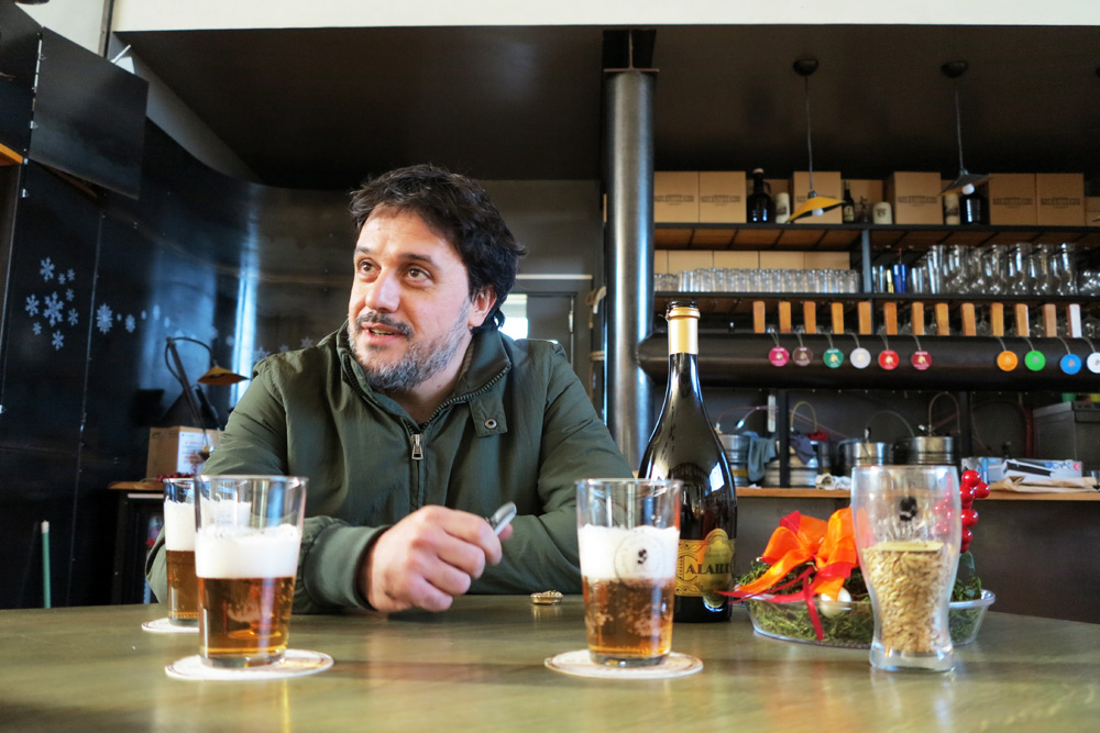 「創業2006年で、イタリアでは結構早い時期に生まれたクラフトビール工房ですが、うちの強みはサプライチェーンがほぼ完全に工房内で賄えていること。冬場だから気がつかないだろうけど、この工房の周囲の畑で僕らの手で麦を栽培し、それを原料にビールを作っています。工房内のパブでは、同じく自家栽培の麦をニッツァのパン屋に持って行き、ビール酵母で発酵させて焼いてもらったパンを使用しています。ビール粕はアルバ郊外の肥育農家に持っていって肉牛の餌として再利用。育った肉牛の肉を今度は僕たちが買い取り、同じくパブで提供する。ビールだけではなく、工房内のパブで用いる食材もほぼ地元産です。でもたった一つ、ホップに限っては今でもドイツ産を用いています。イタリア産でもダメでした。一度、自家栽培のホップで試みたのですが、ドイツ産のような泡立ちがなくアロマも中途半端で結局断念しました。でも、いつか自家栽培のホップでうまいビールを作ってみたいです。