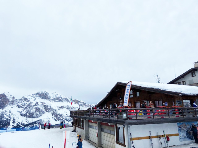 スキーを楽しんで、小腹が空いたら、やっぱりリフージョ。8つあるリフージョの中でも一番標高が高い2362mのカパンナ・トンディに行ってみました。サルシッチャとチーズの入ったパニーノと赤ワインで休憩。ジューシーでとてもおいしかったです。